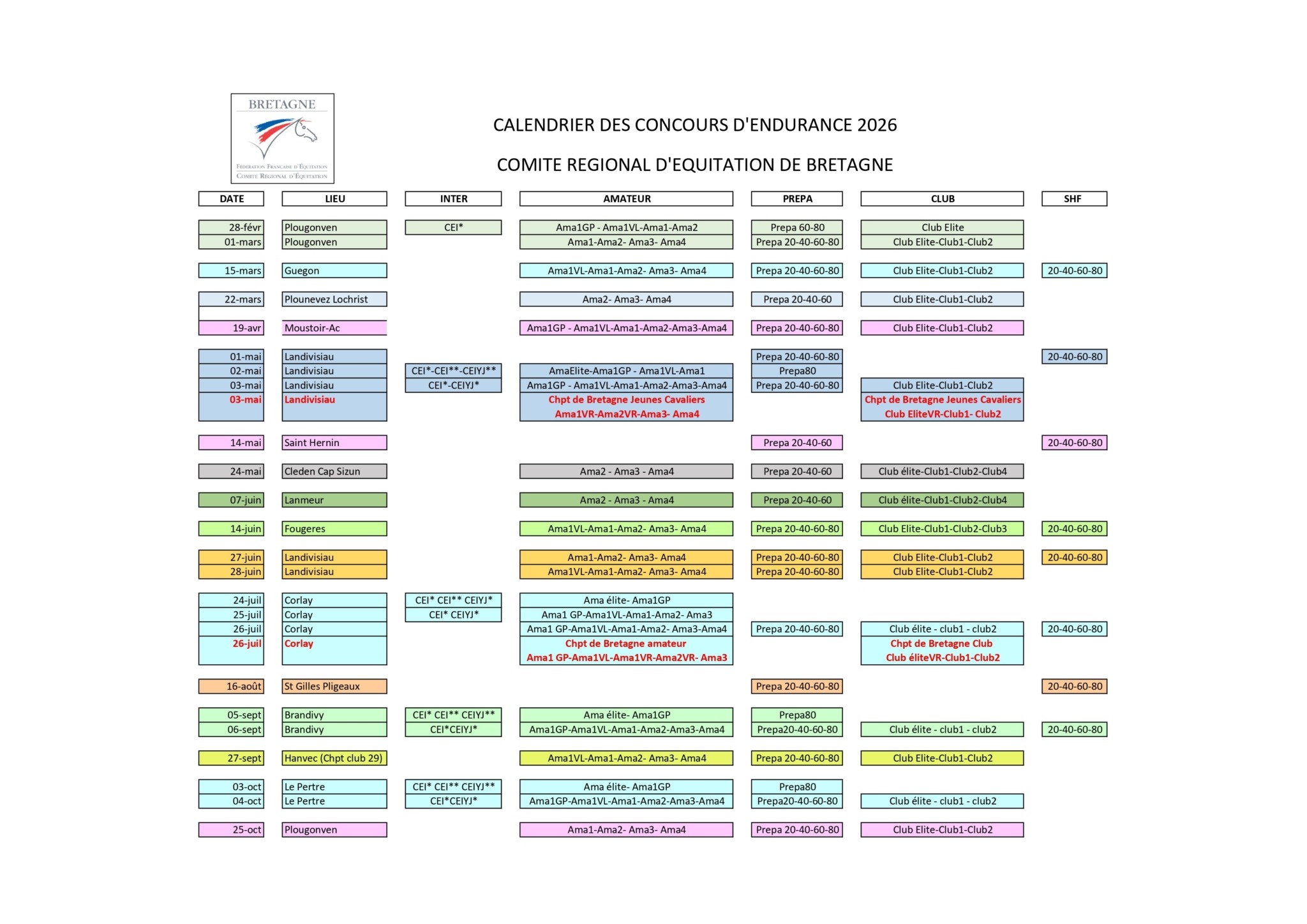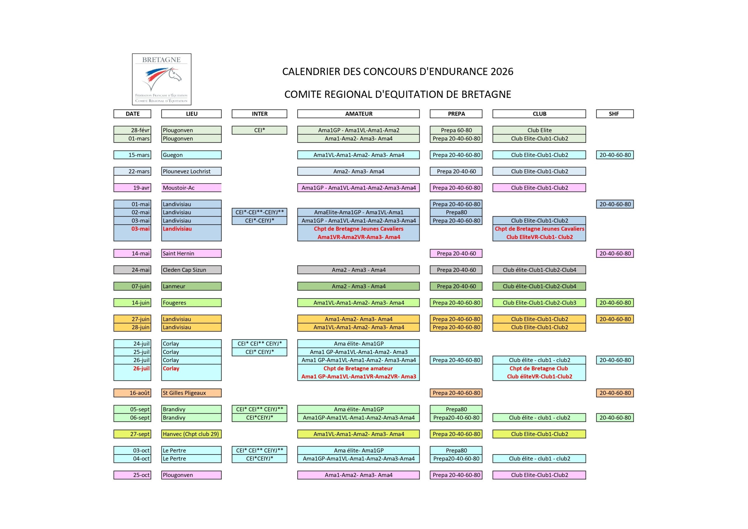 Calendrier des concours d’endurance 2026 en Bretagne MAJ du 31/10/25